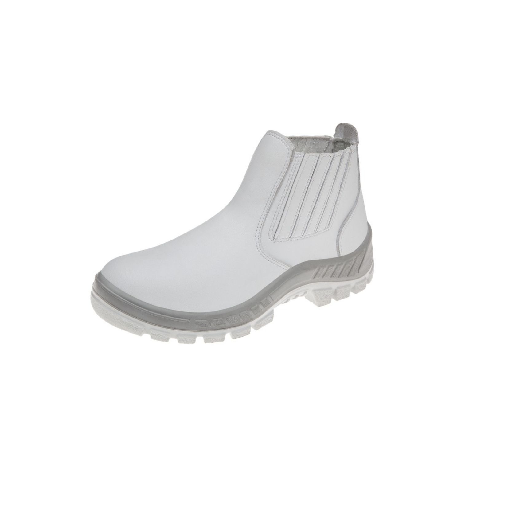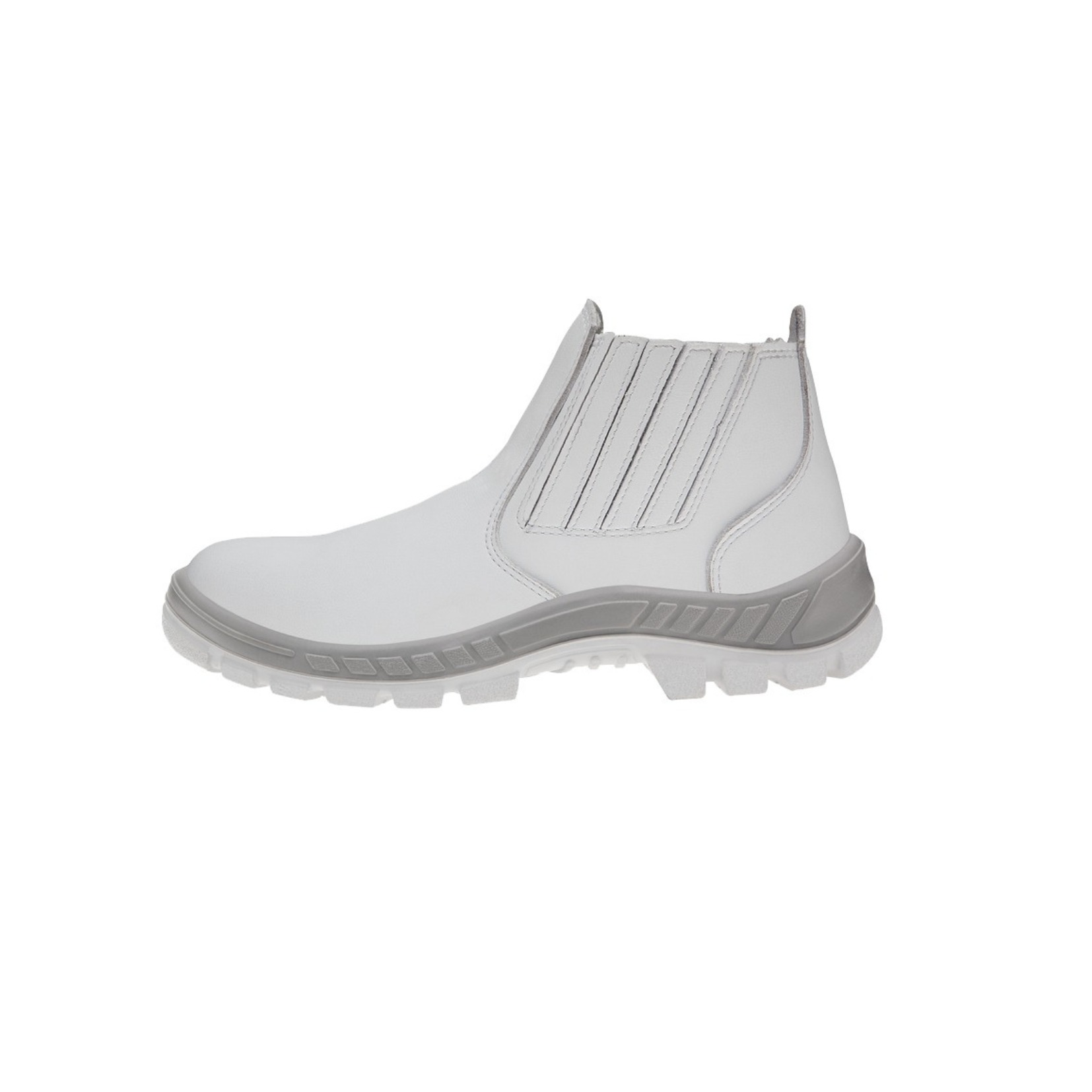 Bota de segurança confeccionada em microfibra na cor branca com faixa cinza na parte inferior do calçado, ideal para profissionais do ramo alimentício, e das áreas da saúde
