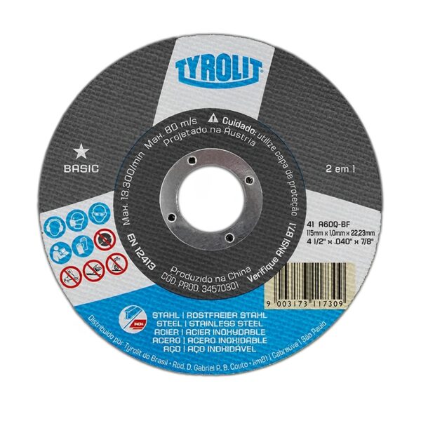 DISCO DE CORTE 4.1/2 X 1,0 A60Q-BF AÇO/INOX CINZA BASIC TYROLIT