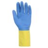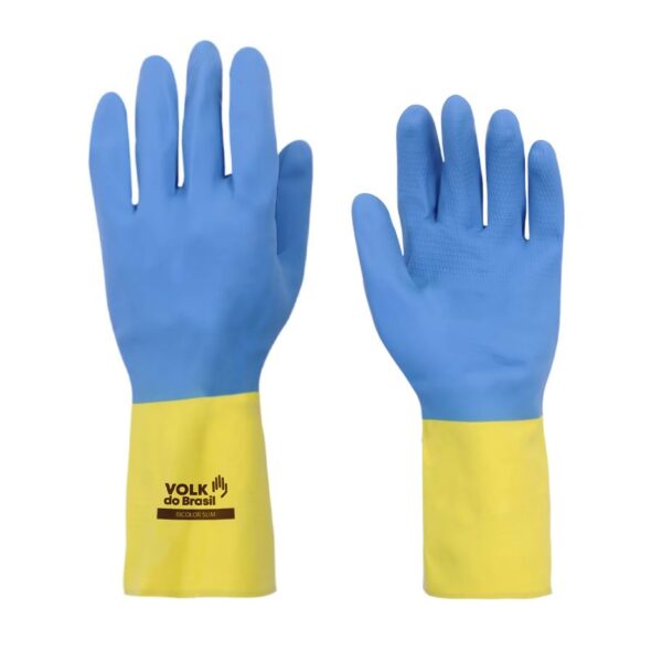 Luva de segurança confeccionada em látex natural e revestimento na face palmar, ponta dos dedos e dorso em neoprene, acabamento antiderrapante na face palmar e ponta dos dedos, revestimento interno em flocos de algodão.