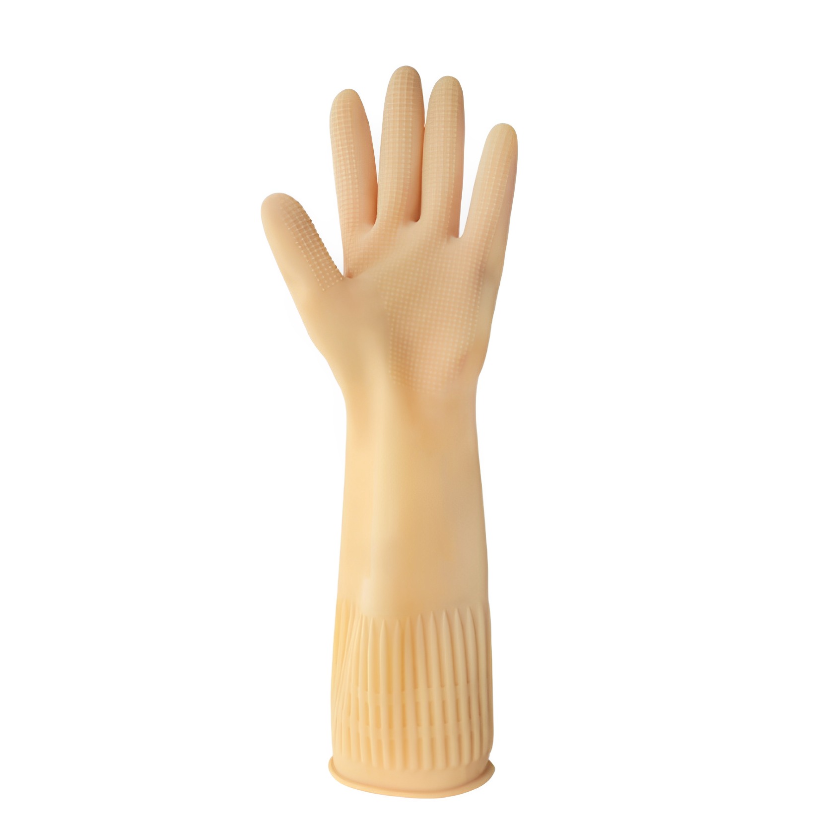 Antiderrapante texturizado na face palmar, face e ponta dos dedos, com detalhes ranhurados no punho
