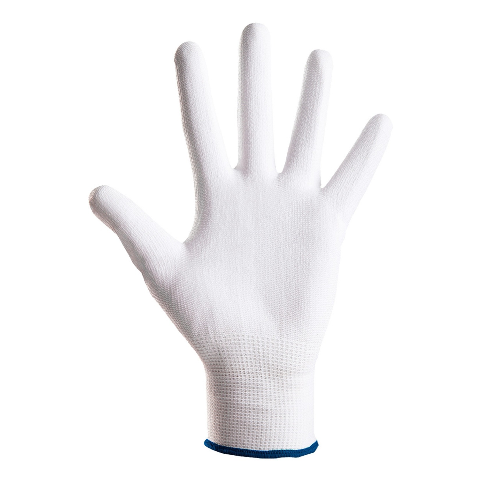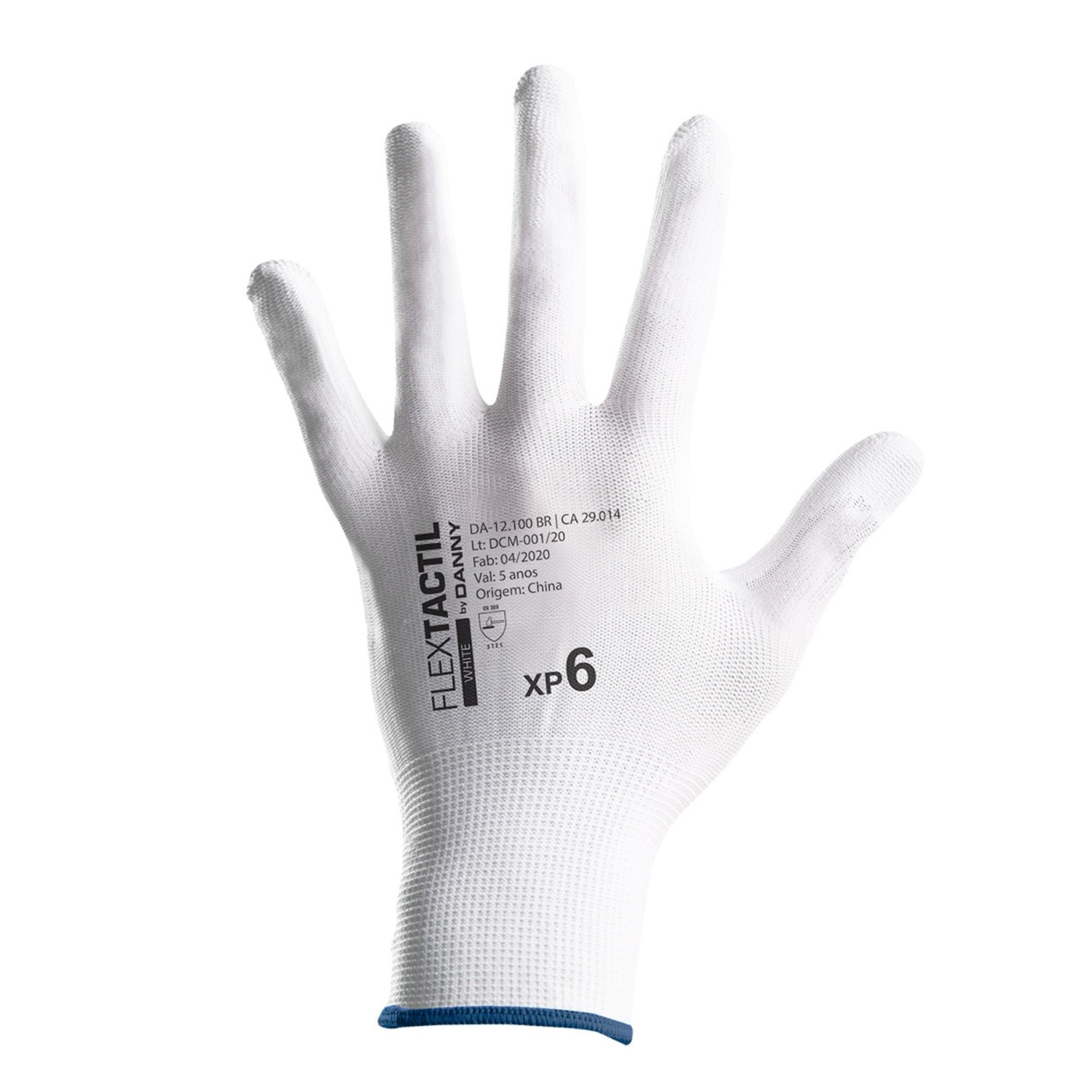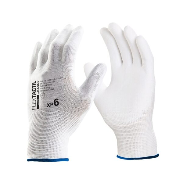 É confeccionada em nylon, recoberta com banho de poliuretano na palma, face palmar dos dedos e ponta dos dedos