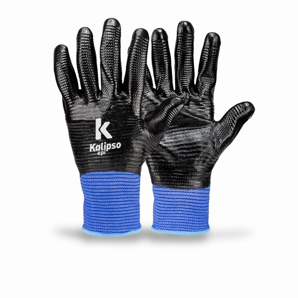 Luva de segurança confeccionada em poliéster, revestimento externo total em borracha nitrílica. Punho em elástico com acabamento em overloque. Com propriedade eletrostática.