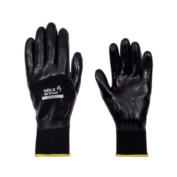 Luva de segurança confeccionada em fibras sintéticas, totalmente revestida com nitrila, lisa, punho em fibras elásticas e acabamento em fibras sintéticas