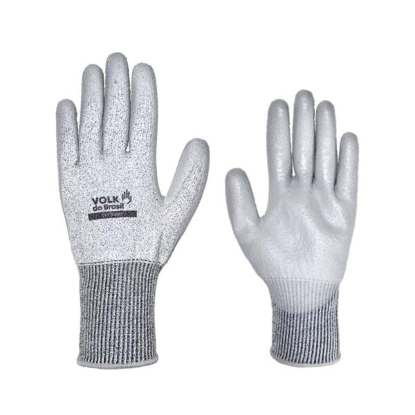 Luva de segurança confeccionada em fios de HPPE (polietileno de alta performance), revestimento da face palmar e ponta dos dedos em poliuretano (PU), punho com inserções de fibras elásticas e acabamento em fibras sintéticas.