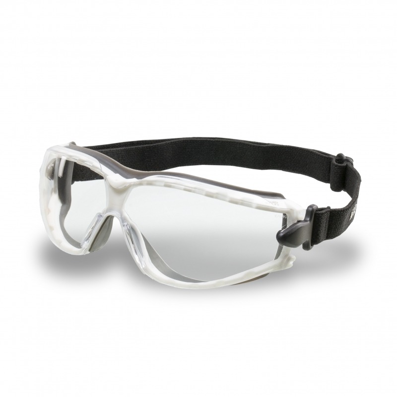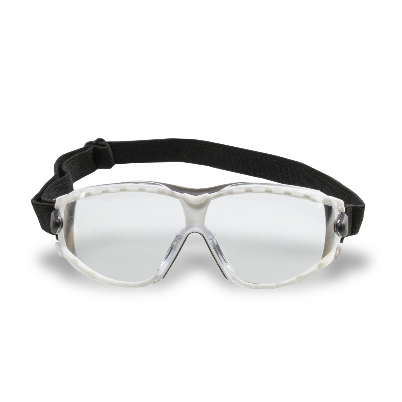 Óculos de proteção, modelo ampla-visão constituído de armação confeccionada em uma única peça de plástico rígido na cor branca