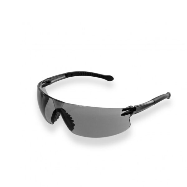 Óculos de proteção, com armação e visor confeccionados em uma única peça de policarbonato cinza