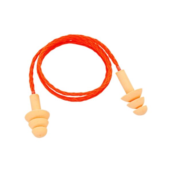 Protetor auditivo, confeccionado em silicone, tipo inserção, composto de um eixo com três flanges